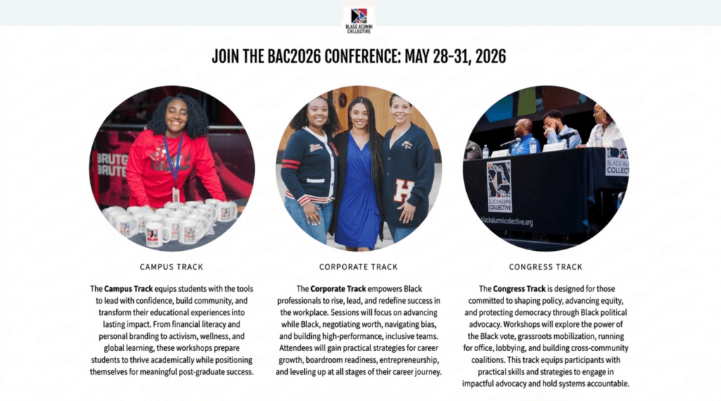 In a moment of rapid change, the need for strong leadership and meaningful impact is greater than ever. The 2026 Black Alumni Collective National Conference embraces the theme “The Fierce Urgency of Now: Black Advocacy from Campus to Corporate to Congress.” This gathering invites us to explore ways to strengthen influence and create meaningful progress across education, industry, and government. Together, we will share strategies, build connections, and accelerate change that uplifts Black communities nationwide.